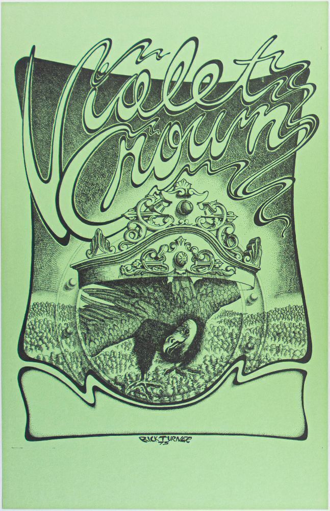 This original poster was designed by the talented Austin artist Rick Turner and produced in 1975 as a tour blank for the band Violet Crown. Rick Turner was part of the early Austin poster artist group scene along with Kerry Awn, Guy Juke, Micael Priest, and others, revolving around several Texas venues during the 1970s.