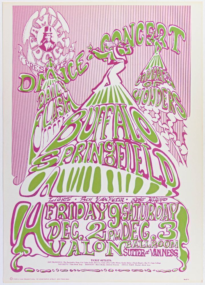 Buffalo Springfield was the launching pad for the careers of Neil Young and Stephen Stills. This short-lived folk-rock band made its first appearance in the Bay Area in November and December of 1966 with performances at both the Fillmore and The Avalon Ballroom.