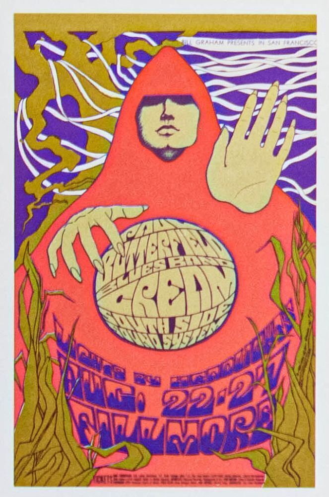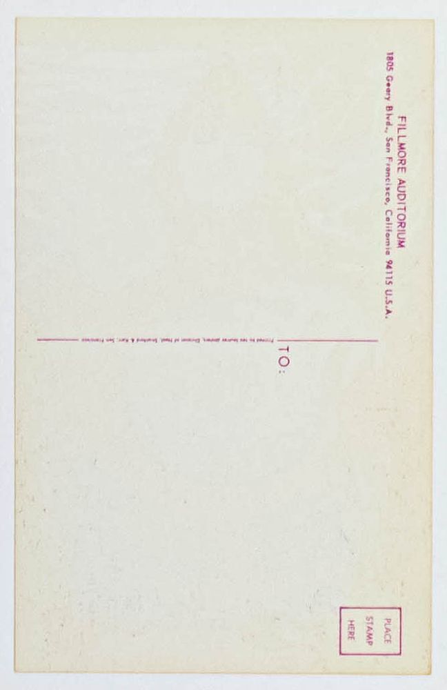 This original postcard was produced for the very first appearance of the power trio Cream at the Fillmore! This was from the Cream's first US tour. Bonnie MacLean was the artist for this one, rendering one of her finest efforts in the series.