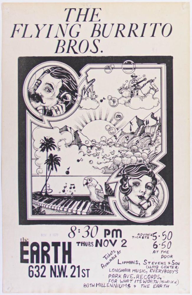 Poster for The Flying Burrito Brothers playing at Portland's The Earth Tavern in 1978.