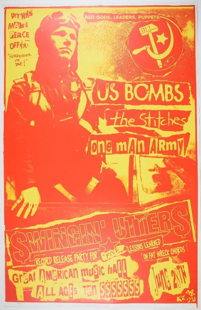 This poster was created by artist Frank Kozik for punk band Swingin' Utters' record release show for their 1998 album Five Lessons Learned, released on Fat Wreck Chords. The event occurred at The Great American Music Hall in San Francisco. The worldwide news in the poster world of his recent passing has created a surge of interest in his beloved material. Artist Frank Kozik got his start gaining popularity for designing posters around the Austin area in the late 80s and early 90s. His abilities grew, and he has since become a member of the Stuckism art movement. His vast collection of beautiful work includes bands like Nirvana, Pearl Jam, Soundgarden, and Stone Temple Pilots.