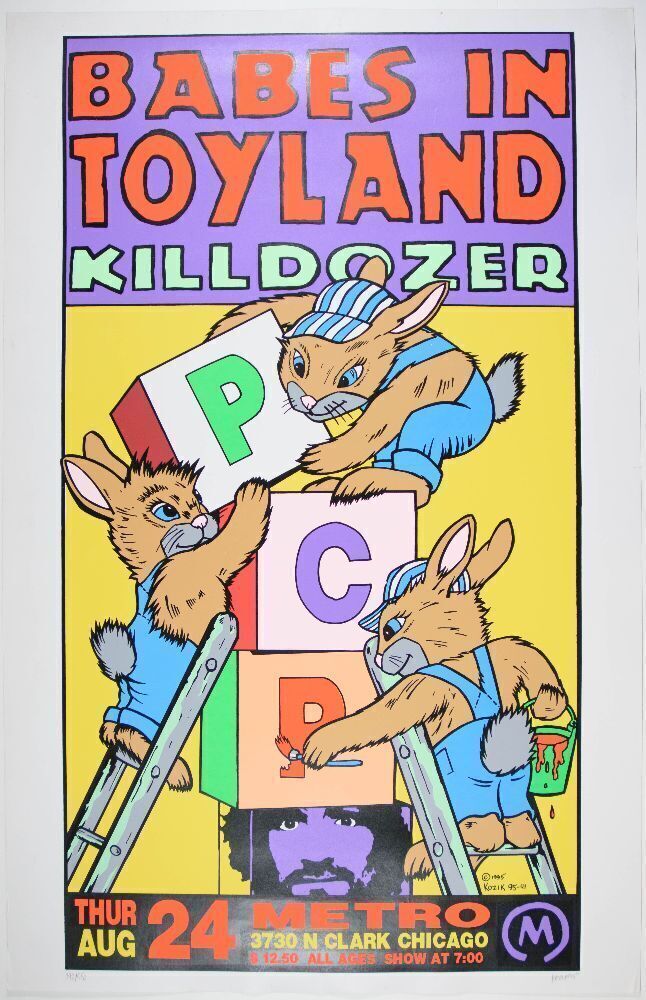 This poster was created for Babes in Toyland appearing at Metro in Chicago on August 24th, 1995. The worldwide news in the poster world of his recent passing has created a surge of interest in his beloved material. Artist Frank Kozik got his start gaining popularity for designing posters around the Austin area in the late 80s and early 90s. His abilities grew, and he has since become a member of the Stuckism art movement. His vast collection of beautiful work includes bands like Nirvana, Pearl Jam, Soundgarden, and Stone Temple Pilots.