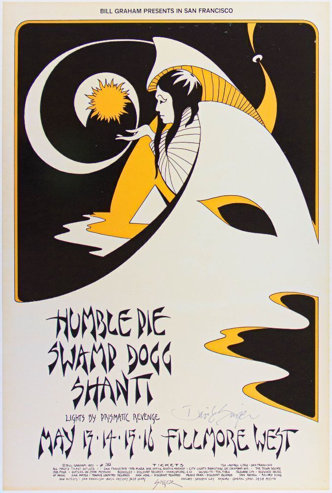 This poster was created by David Singer for Humble Pie, Swamp Dogg, and Shanti at the Fillmore West in 1971. The BG-280 is the companion issue to the BG-279 with Miles Davis and Elvin Bishop Group.