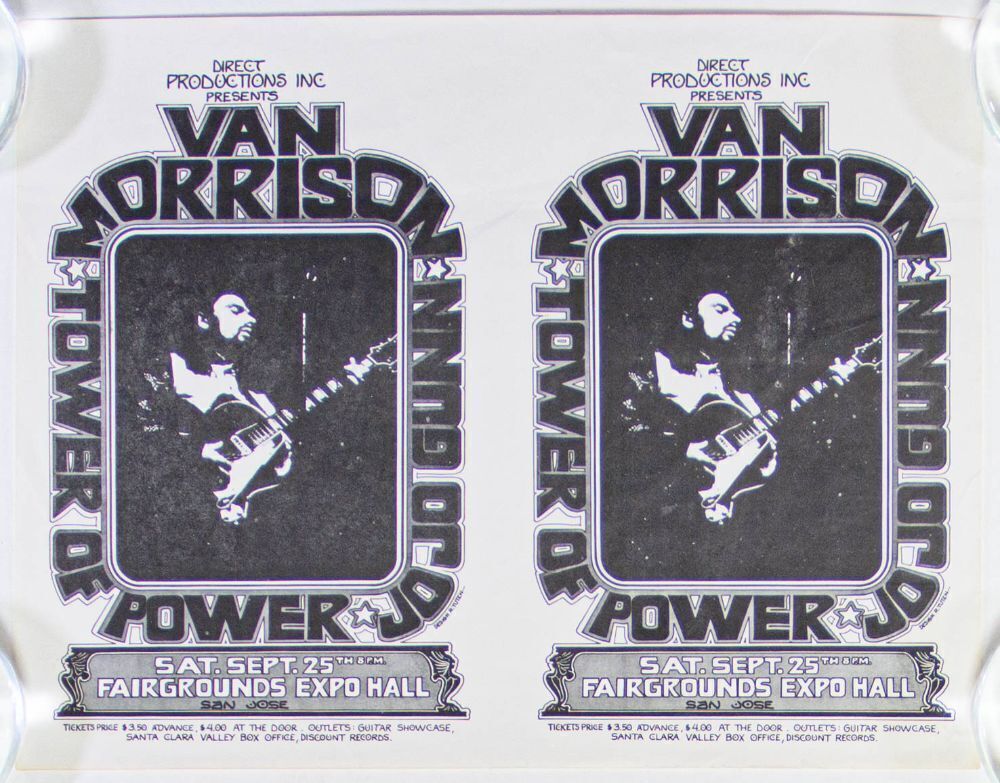 This double uncut handbill by Randy Tuten was produced for Van Morrison's appearance at the San Jose Fairgrounds Expo Hall on September 25th, 1971, with Tower of Power and Jo Jo Gunn. Van Morrison's illustrious career started with the 1960s garage rock band "Them". From there, he created one of the most prolific and long-running solo careers of any of the 1960s performers. Morrison is known for his unique blend of blue-eyed soul jazz and R&B, and has created some of the music world's finest hits along the way. Although he has been known to be a mercurial live performer, when he was on his game, there was none finer.