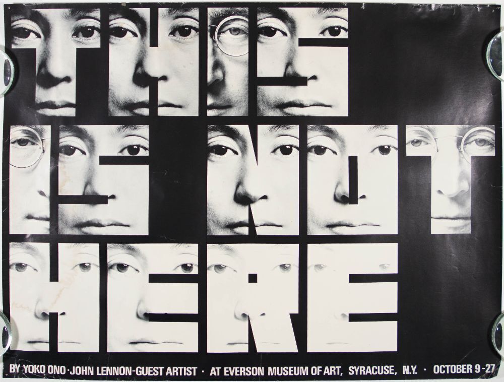 This poster was produced for Yoko Ono's 1971 retrospective art exhibition, "This Is Not Here", which featured John Lennon as a guest artist. The exhibition was held at the Everson Museum of Art in Syracuse, New York, from October 9-27, 1971.