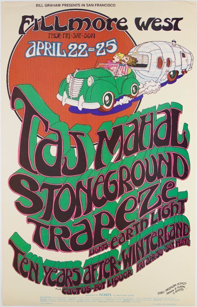 This original poster was created by Tuten & Bread for a Fillmore West show that featured Taj Mahal. Taj was a regular fixture in the San Francisco scene and a frequent performer at the Fillmore. His take on American roots music has been well documented during his 45+ year career as a recording artist. This poster also announces a run of shows by Ten Years After at Winterland.