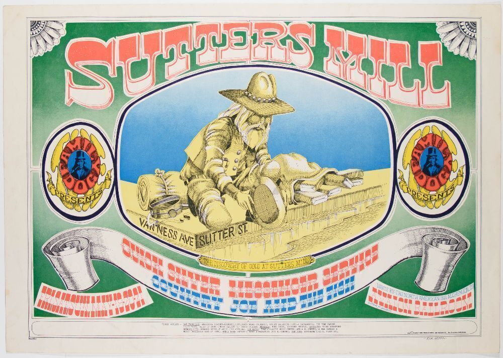 This Quicksilver Messenger Service, Country Joe and the Fish poster, designed by Rick Griffin, illustrated the 1960s counterculture perspective of panning for gold at Sutter's Mill. This Avalon poster is a classic and satirical poster from the pen of Griffin.
