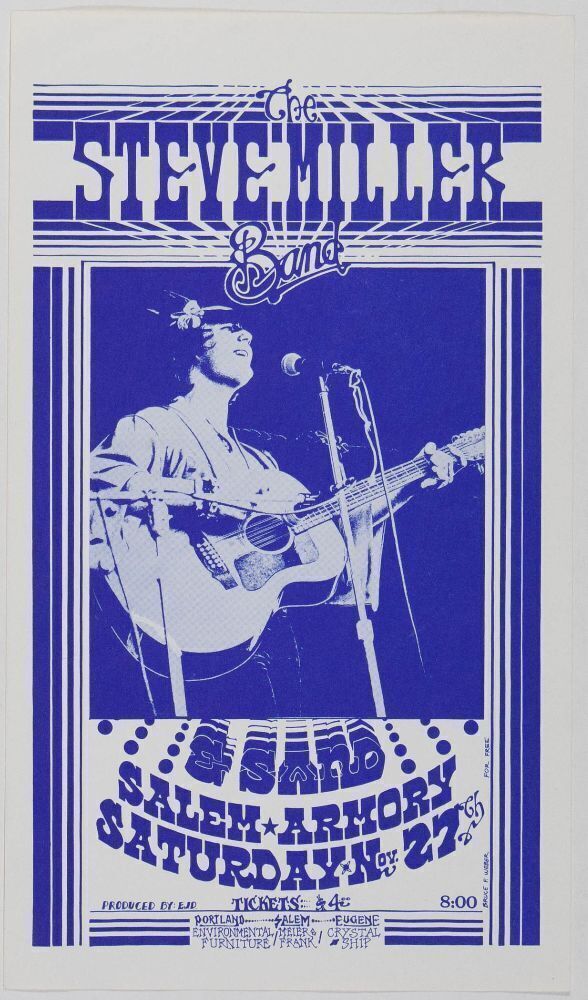 Steve Miller (aka "Gangster of Love") began his performing career in 1965 in Chicago when he formed the "Goldberg-Miller Blues Band", which morphed into the Steve Miller Blues Band, which he formed in San Francisco in 1967, and with many changes in his band personnel over the years, is still gigging today. This handbill announced his appearance at the Salem Armory on November 27th, 1971.