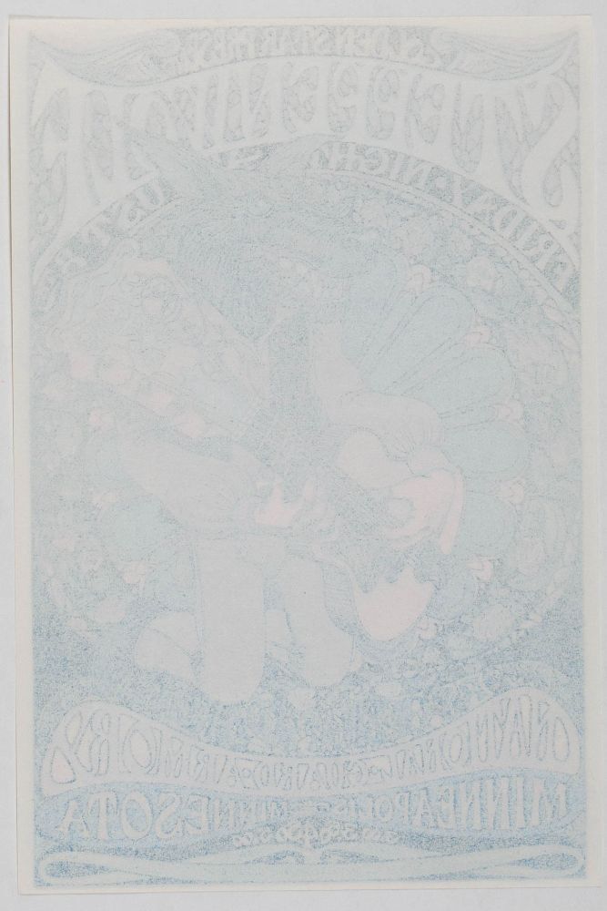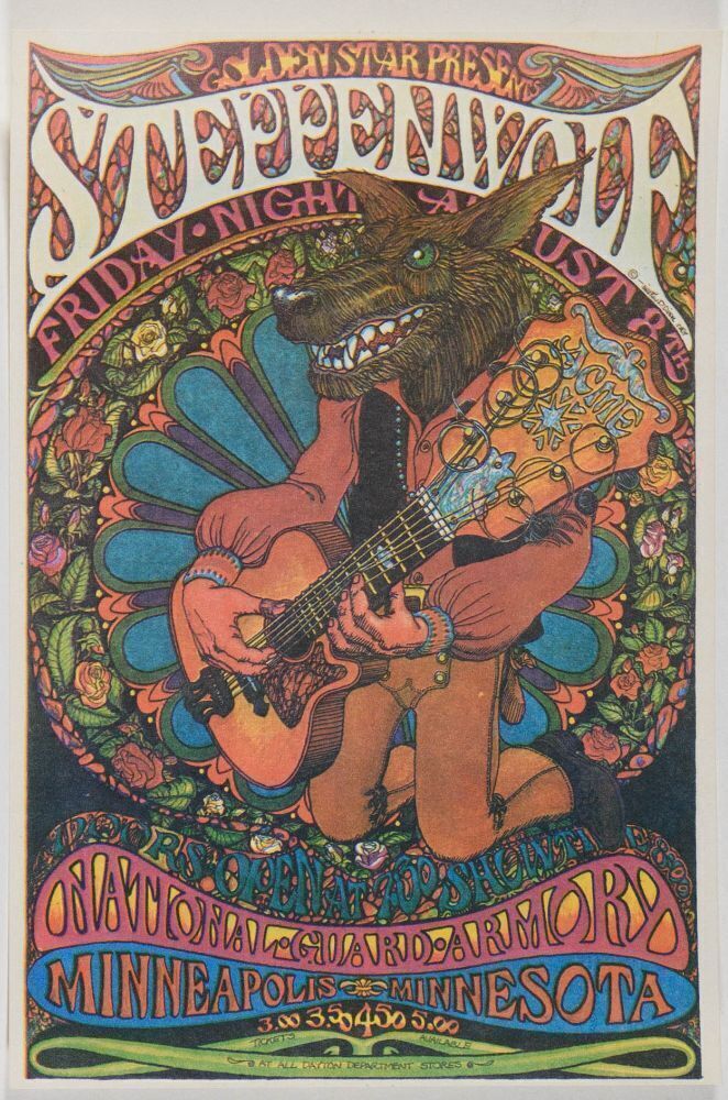 This original handbill was produced for a concert by Steppenwolf at the National Guard Armory in Minneapolis, Minnesota, on August 8, 1969. The Canadian band was one of the more successful bands of the era, with huge paydays for the hits Born to Be Wild and Magic Carpet Ride. This piece was designed by artist Timothy Dixon. Dixon also designed artwork on promo material for additional shows during the same tour in Kansas City, Houston, New Haven, and Providence.