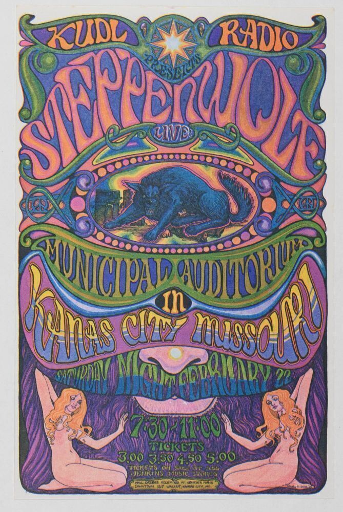 This original handbill was produced for a concert by Steppenwolf at the Kansas City Municipal Auditorium on February 22nd, 1969. The Canadian band was one of the more successful bands of the era, with huge paydays for the hits "Born to Be Wild" and "Magic Carpet Ride". The word Kansas on the poster is erroneously misspelled. This beautiful piece was designed by artist Timothy Dixon. Dixon also designed artwork on promo material for additional shows during the same year in New Haven, Houston, Minneapolis, and Providence.