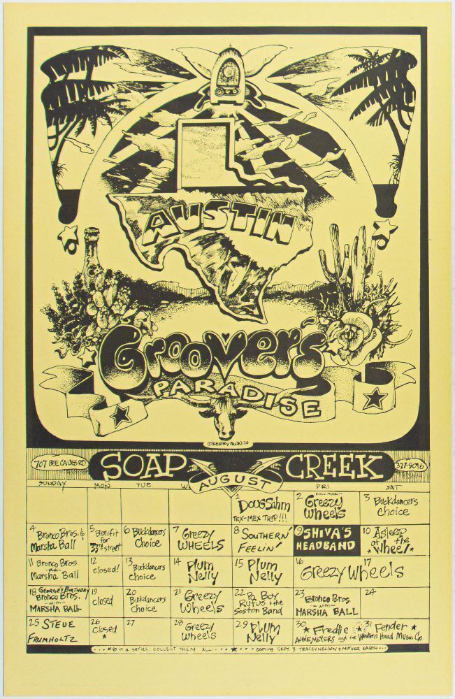 Soap Creek Saloon was a small venue in Austin, Texas, which attracted many of the local hippies and cowboys to the music scene there, which was already a hot spot due to other area venues like Armadillo World Headquarters. Often, the same artists would design posters for both venues. This poster was produced to promote all the shows happening at the venue in August 1974.