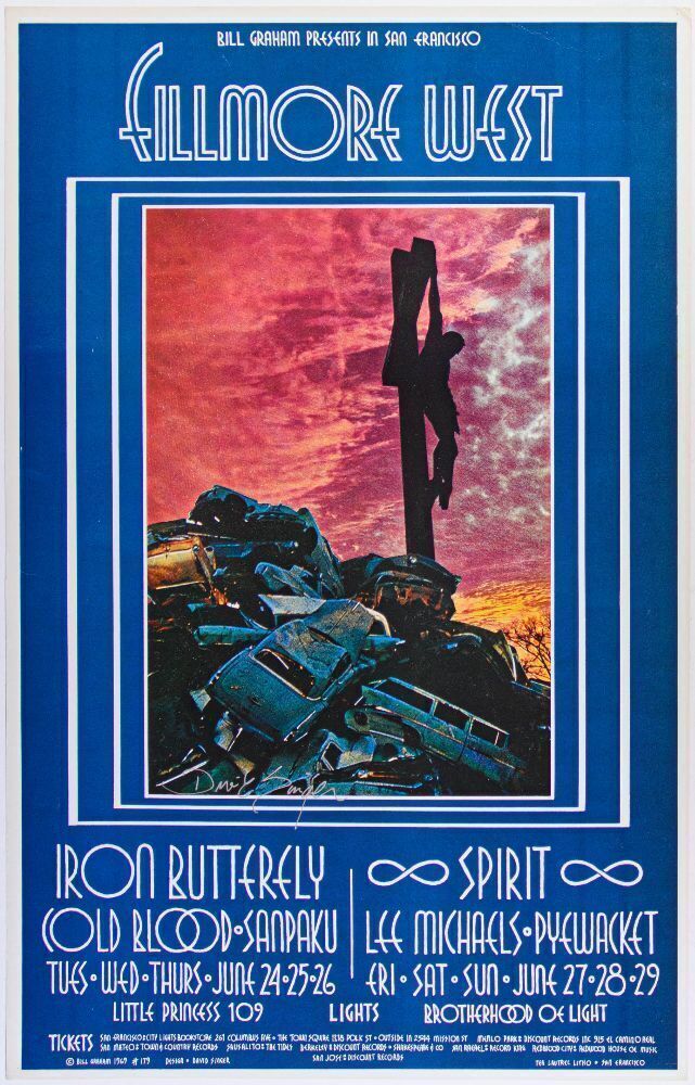 Original first-printing poster featuring Iron Butterfly, Cold Blood, Sanpaku, Spirit, Lee Michaels, and more at the Fillmore West during the summer of 1969. Not a poster we see surface in our auctions very often.