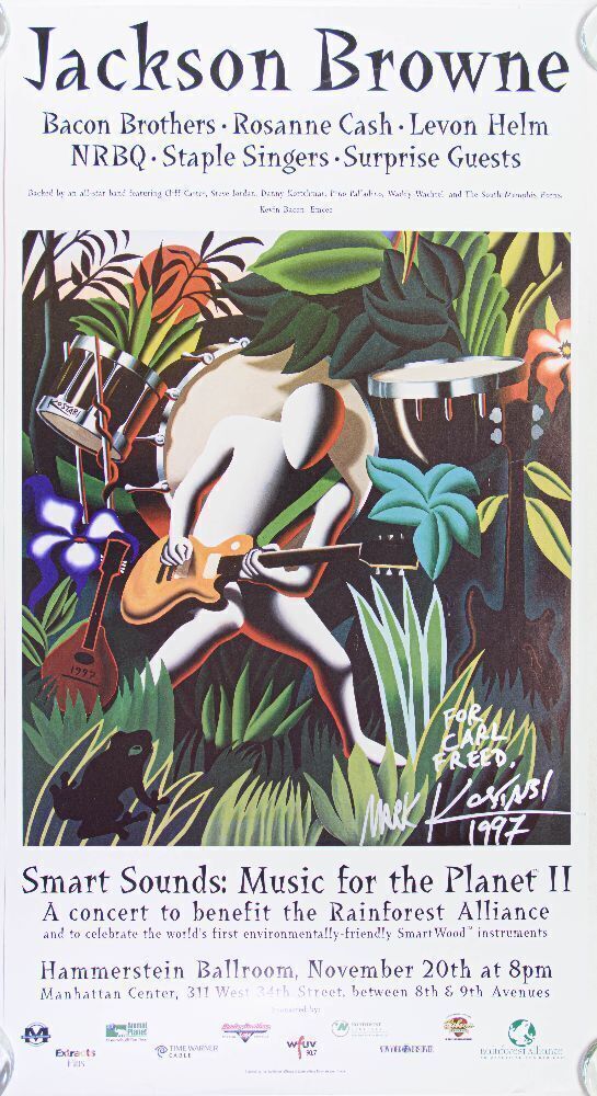 This poster announced "Smart Sounds: Music for the Planet II" a concert benefit for the Rainforest Alliance at the Hammerstein Ballroom in New York City in November 1997. The event was headlined by Jackson Browne with support from Bacon Brothers, Rosanne Cash, Levon Helm, NRBQ, Staple Singers, and more. Artwork by Mark Kostabi.