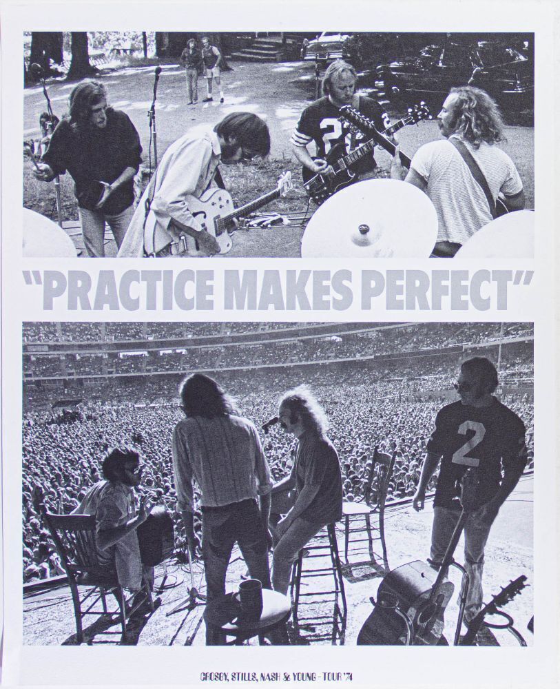 This vintage poster was produced as a merchandise item for Crosby, Stills, Nash & Young's 1974 tour. Reading "Practice Makes Perfect", it combines two photographs of the band, one of them practicing and one of them playing to a packed stadium.