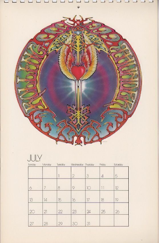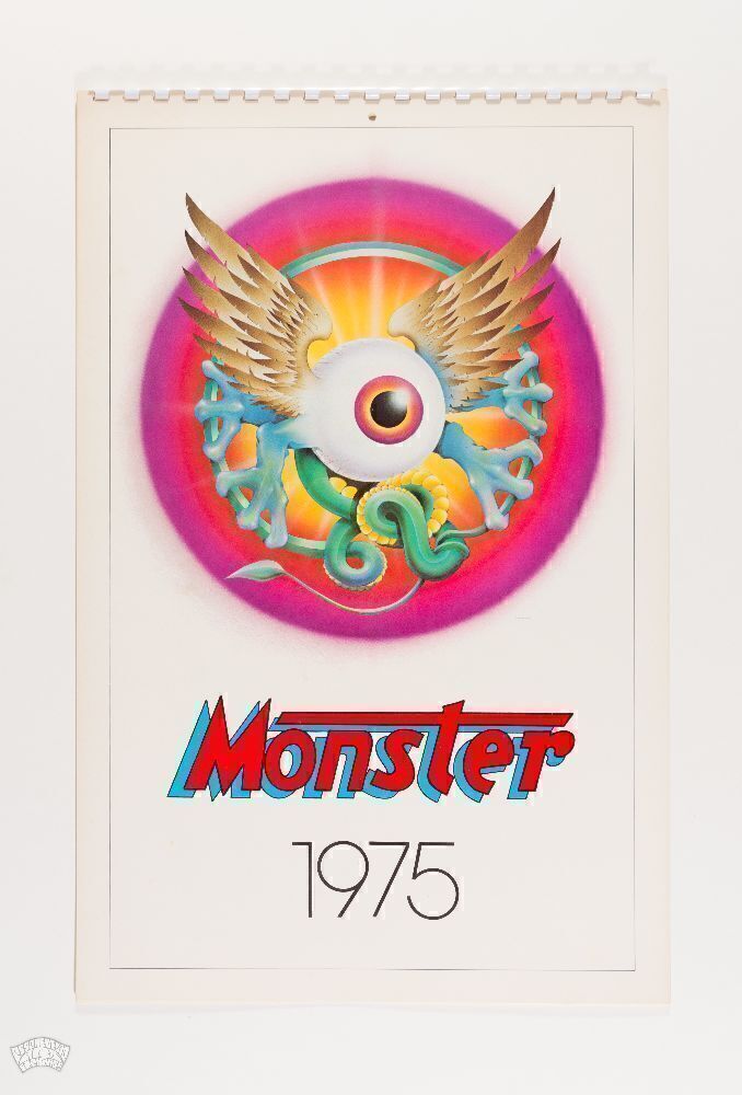 Mouse Studios MONSTER Calendar 1975, First Printing. Features 13 full-color airbrush illustrations by Stanley Mouse & Alton Kelley produced for their Monster Company business. Included are several illustrations of The Flying Eyeball old hot rods, an old Merc a Deuce coupe, a Lady Luck illustration, a Flying Saucer in Outer Space, a couple of marijuana designs, and the beautiful Rolling Thunder psychedelic artwork. Printed on thick stock, plastic comb-bound at the top edge.
