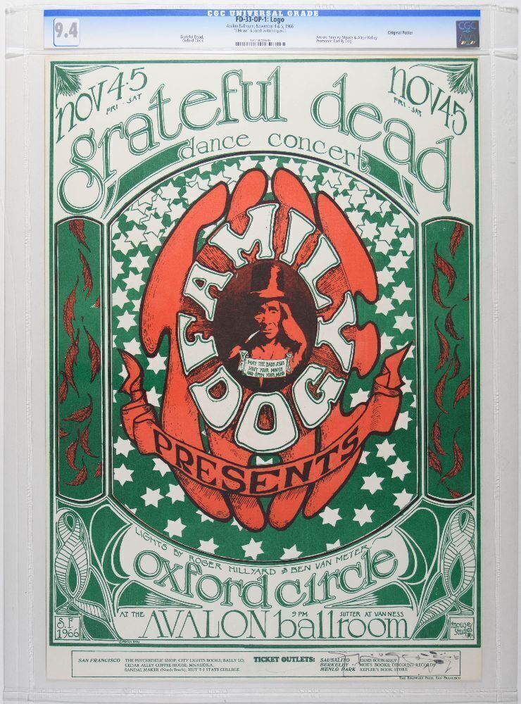 Presenting an original example of this first printing poster in our auction! The FD-33 is one of the most sought-after Grateful Dead posters in the Avalon Series. This striking yet simple design by Mouse and Kelley utilizes the Family Dog logo in striking Green and Red. A very tiny fraction of the original issuance has survived the past 55+ years!