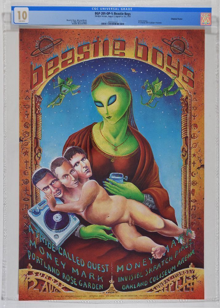 A HIGH GRADE PERFECT 10! This amazing poster by artist Emek was produced for three Beastie Boys shows promoted by Bill Graham Presents in August and September 1998 at the Portland Rose Garden and the Oakland Coliseum Arena. The band had just released their fifth studio album, Hello Nasty, in July.