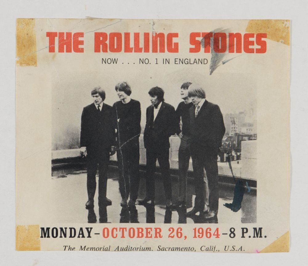 This super early Original Handbill was produced for The Rolling Stones performing at the Memorial Auditorium in Sacramento on Monday October 26 1964. The concert featured the Righteous Brothers in support and was the first stop on the Rolling Stones Second US tour and was actually re-scheduled (and occurred) on October 30th. The tour was supporting their 2nd studio album “12 x 5” which was released a week prior on October 17th. Vintage Rolling Stones material from their early days are highly sought after. Visiting the United States in 1964 was a big deal for the Stones and had a lasting impact on the start of their career. They recorded for two days at Chess Studios in Chicago. While there they met many of their most important influences including Muddy Waters. Those Chess sessions included their cover version of Bobby and Shirley Womack's "It's All Over Now" which would become their first No. 1 hit in the UK. By the end of the year the Jagger/Richards original "Heart of Stone" with "What a Shame" as the B-side single went to No. 19 on the US charts.