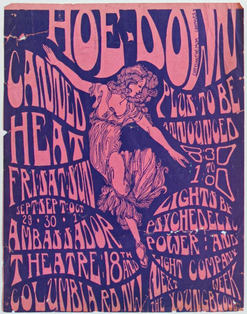 Here's a flyer advertising a concert series called "Hoe Down" featuring Canned Heat at the Ambassador Theatre in Washington, D.C., in September and October 1967. A beautiful psychedelic design! We've never offered another example of this flyer in our auction.