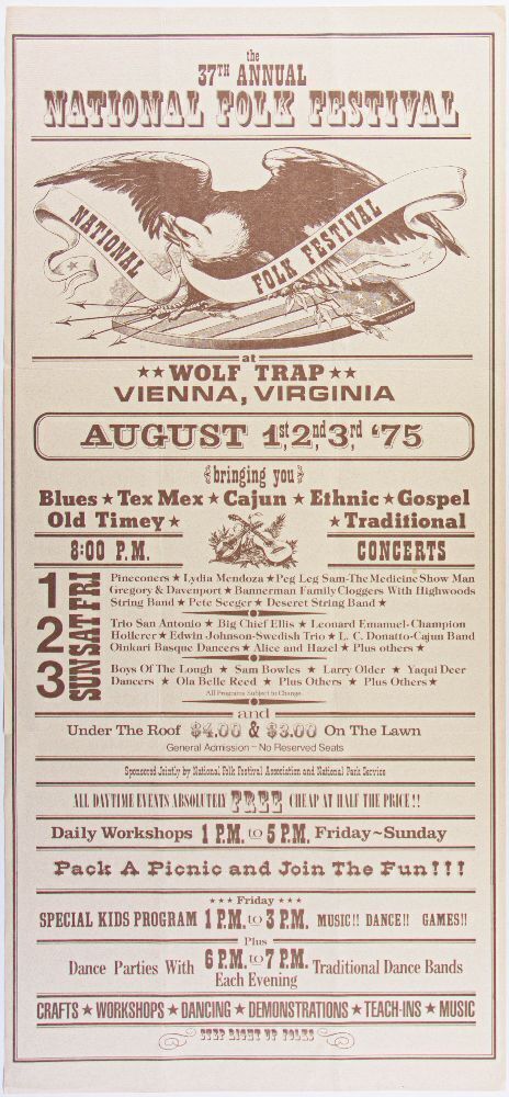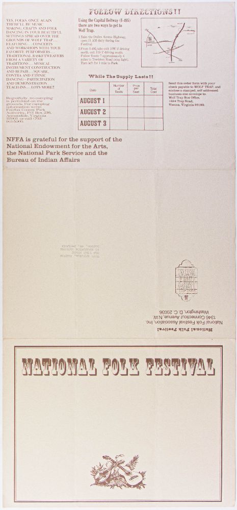 This mailer was produced for the 37th annual National Folk Festival, held at the Wolf Trap in Vienna, Virginia, in August 1975. The festival featured a combination of blues, Tex-Mex, Cajun, ethnic, gospel, old timey, and traditional music. Performers included Pete Seeger, Lydia Mendoza, Peg Leg Sam, and many more. This is the first of this issue to appear in our auction!