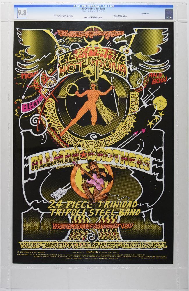 Artist Norman Orr's BG-268 Fillmore West original concert poster is a fan favorite in every respect. The Country Blues/Rock phenomenon Hot Tuna has been in existence for the last 45+ years and is still going strong! The Duo of Jorma Kaukonen and Jack Casady has long outlived the Jefferson Airplane. The Allman Brothers' historic shows at the Fillmore East in 1971 have been immortalized on one of the best live albums of all time. This run of shows at the Fillmore West combined both of these incredible bands on the same stage!