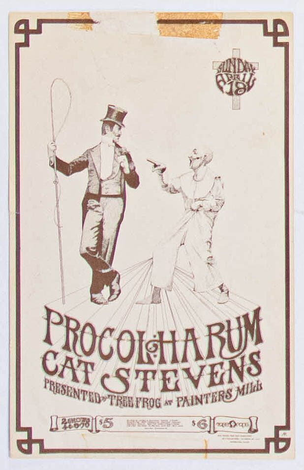 This original handbill was produced for Procol Harum (with Cat Stevens in support!) appearing at Painters Mill Music Fair in April of 1971. Procol Harum is a British rock band known for its unique fusion of rock, classical music, and progressive rock. The band was formed in London in 1967 and is perhaps best known for their iconic and timeless song, "A Whiter Shade of Pale", which was released in 1967 and remains one of the classic anthems of the 1960s. Having established a signature sound, Cat Stevens enjoyed a string of success in the early seventies. His "Teaser and the Firecat" album would be released a few months after this show. It reached number two on the charts and achieved gold record status within three weeks of its release. The legendary record included several timeless hits like "Peace Train", "Morning Has Broken", and "Moonshadow". Tree Frog Productions was a grassroots promotion company that staged concerts at Painters Mill Music Fair, a small theater in Owings Mills, Maryland, a suburb north of Baltimore. This artwork was produced by Alan Rose, who went on to work with National Lampoon and create album artwork for bands including It's A Beautiful Day. The advertisements were printed in small quantities and are next to impossible to find in any condition. A rare original handbill that will likely not appear again in our auction anytime soon!