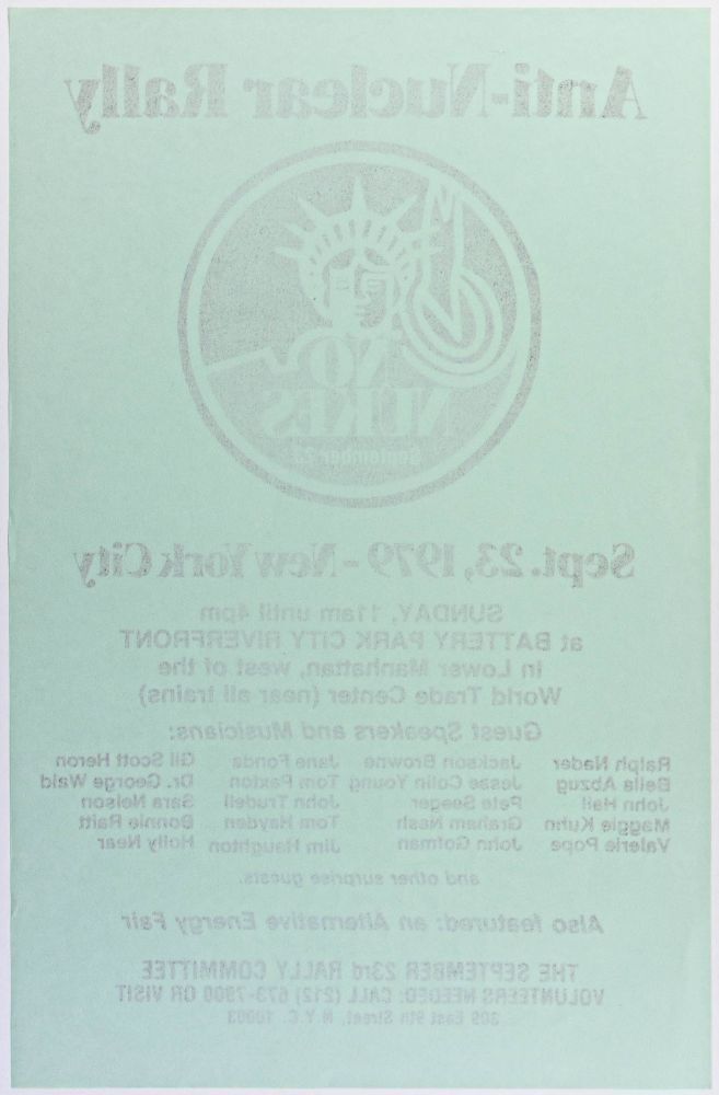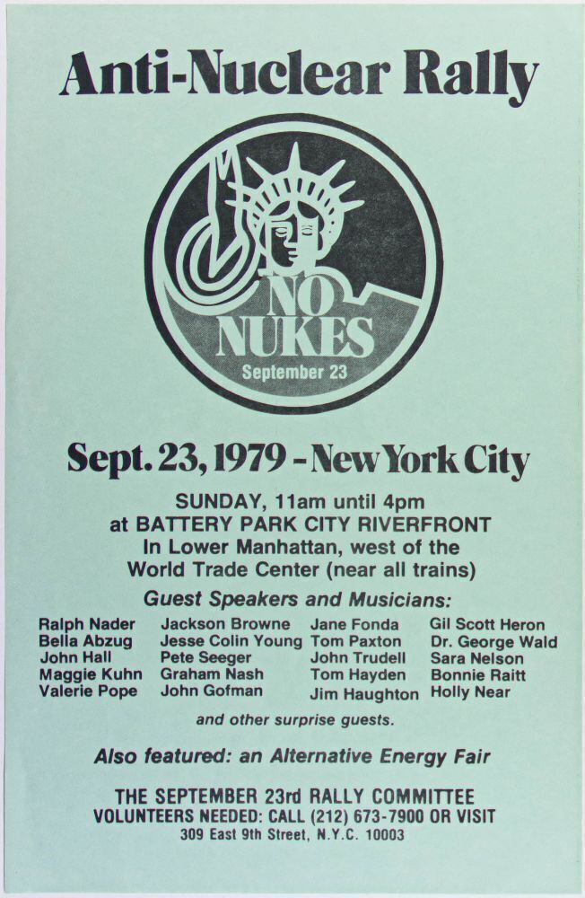 Bonnie Raitt, Jackson Brown, Graham Nash, and more are featured on this September 1979 poster from the "No Nukes" anti-nuclear rally at Battery Park in New York City. The rally featured a variety of guest speakers and musicians, along with an "Alternative Energy Fair". This item remains in MINT condition!