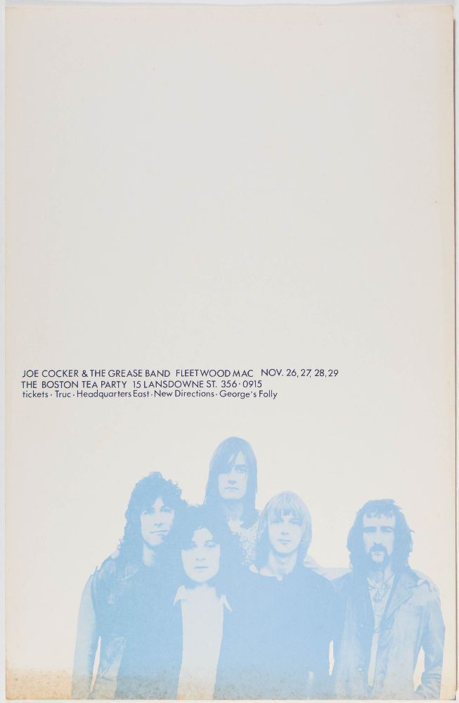 This rare poster announced the lineup of Fleetwood Mac and Joe Cocker & The Grease Band appearing at the legendary Boston Tea Party for four nights in November 1969. Fleetwood Mac had released their third studio album, Then Play On, just a few months prior. Joe Cocker was playing with his band, The Grease Band, at the time and had released his debut album, With a Little Help From My Friends, earlier that year as well.