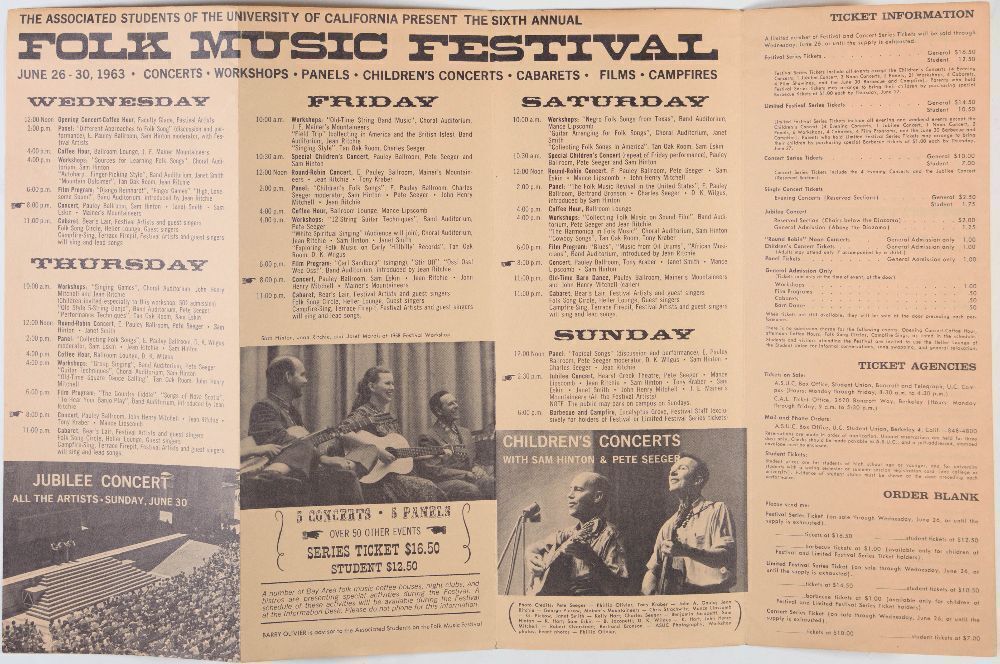 This RARE ticket order form mailer (double sided and folds out) was produced to promote the 1963 Berkeley Folk Music Festival held at the University of California, Berkeley, featuring headliners Pete Seeger, Jean Ritchie, Mance Lipscomb and many more!