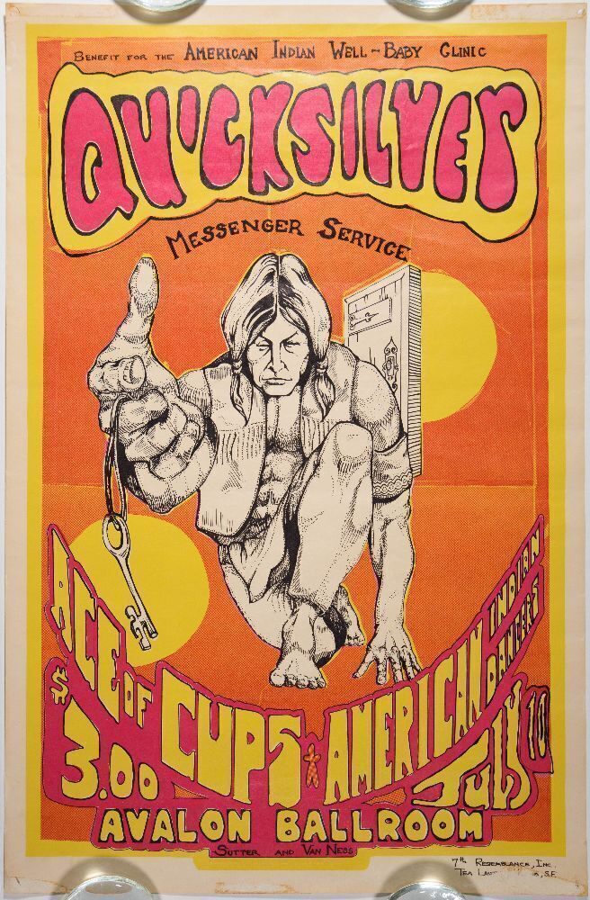 This rare poster has never appeared in our auction before! It announced Quicksilver Messenger Service appearing at the Avalon Ballroom on July 10th, 1968. The show was a benefit for the American Indian Well-Baby Clinic. Supporting acts included Ace of Cups and the American Indian Dancers. It appears in the Art of Rock, plate 2.21, where it is misattributed to 1967.