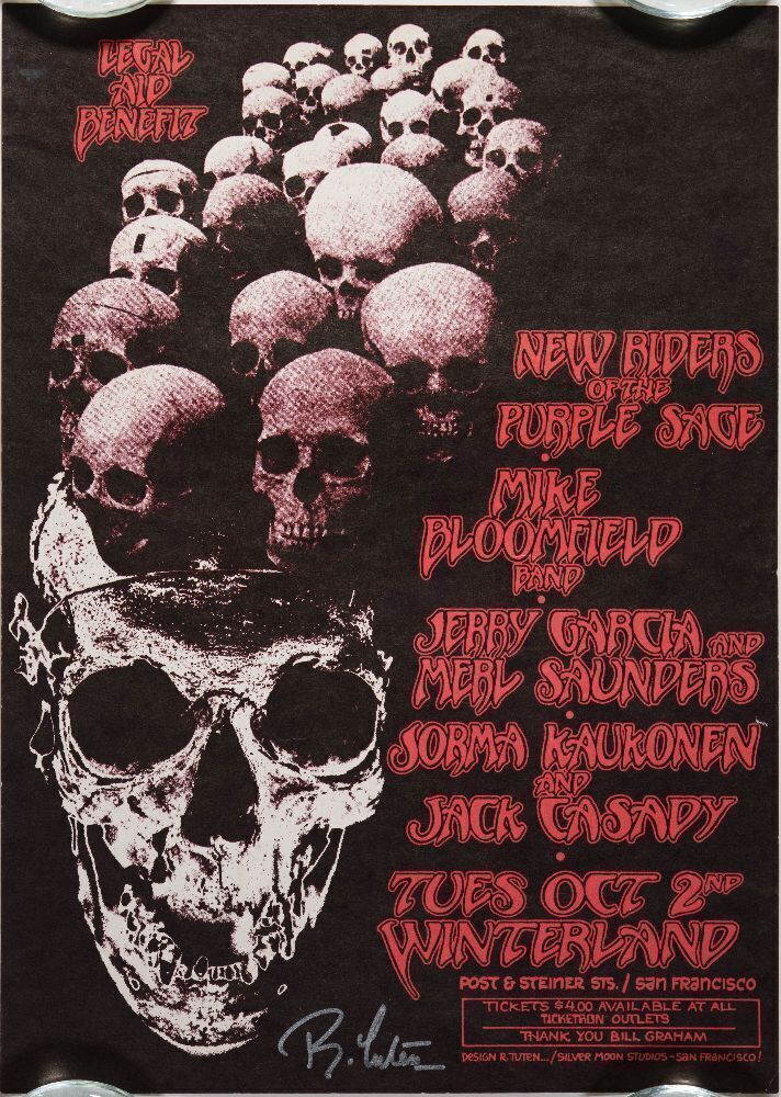 Jerry Garcia and Merl Saunders, the New Riders, Mike Bloomfield, Jorma, and Jack are featured on this lineup at Winterland Arena. This small 10 x 14 original poster exhibits the event billed as a legal aid benefit, but it was really the Hells Angels party for 1973. Allegedly at the time, Sonny Barger & The Hells Angels were in trouble, so it was decided by Bill Graham and the Hells Angels that changing the bill was for the best. A popular issue designed by artist Randy Tuten.