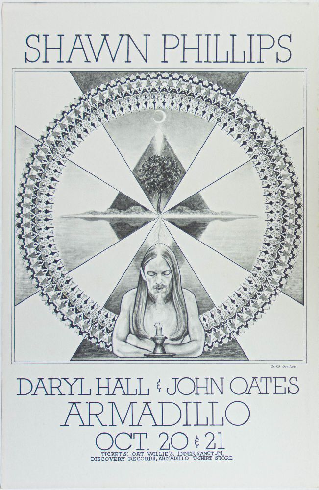 This Guy Juke original concert poster announced Shawn Phillips along with Daryl Hall & John Oates at the Armadillo in Austin Texas during 1975. More than many of the great poster artists, Guy Juke continually experimented and developed his artistic styles. Overtime his reputation has deservedly grown as collectors gain perspective on his brilliance. Interest in Armadillo posters is currently at an all time high!