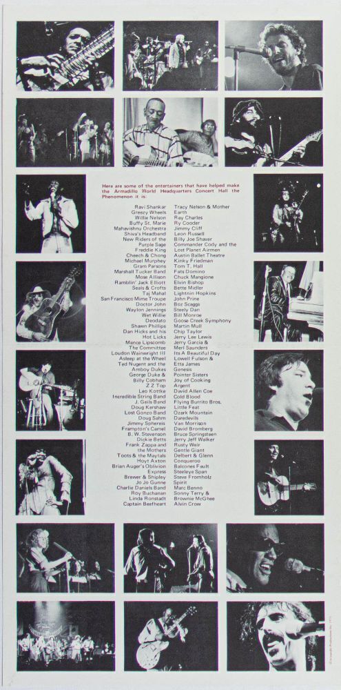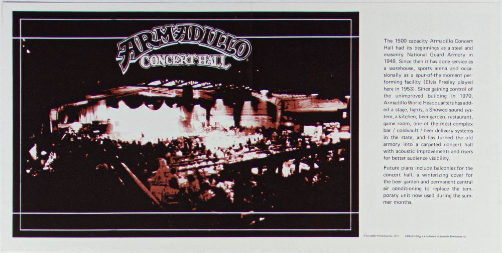 The Armadillo opened in Austin just after the closing of the Vulcan Gas Company. It went on to become the premier venue in that musically rich city from 1970 to 1980. This legendary club offered an incredibly eclectic range of performers in its 10-year tenure. This double-sided flyer was produced and distributed in 1975 celebrating the venue's legacy of performers who had appeared during the first 5 years of the club.