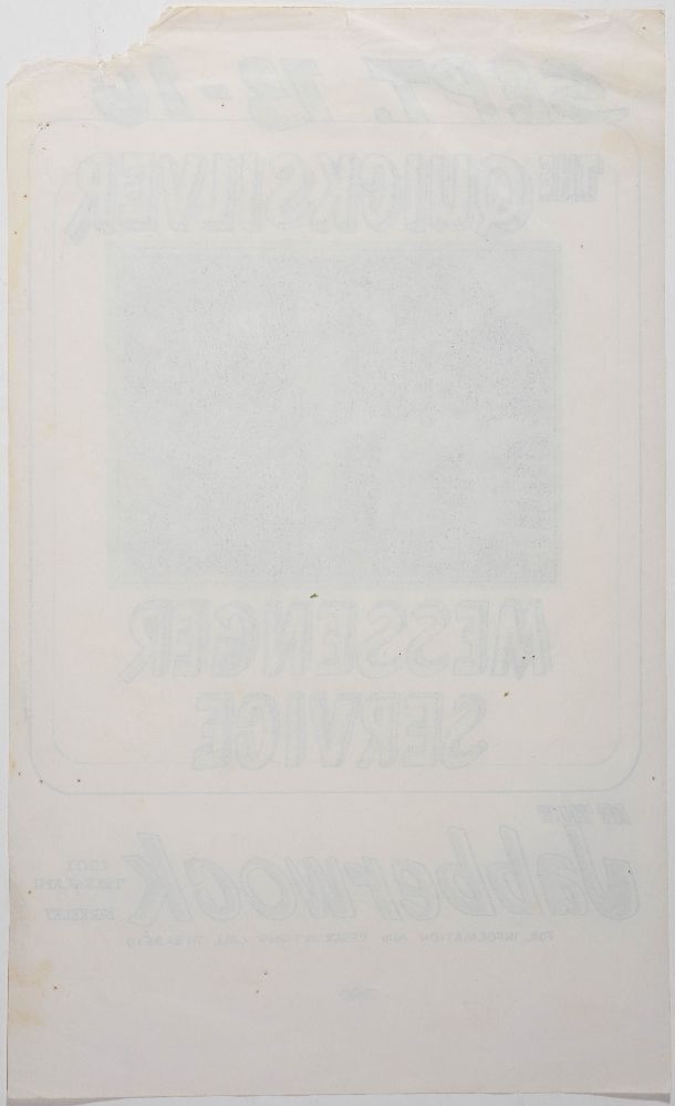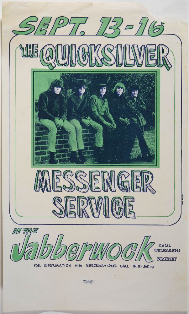 This vintage, small-sized poster was produced for Quicksilver Messenger Service, appearing at The Jabberwock in Berkeley during 1966. This was the first time the band played this historic venue. The Jabberwock started as a successful jazz club in the early sixties until it was purchased by Bill "Jolly Blue" Ehlert in 1965. Ehlert converted much of the venue's performances to a more psychedelic sound. In 1966, Ehlert hired Jesse Cahn, who had been a guest drummer for the Chambers Brothers, to co-manage the Jabberwock while he ran the Matrix in San Francisco.