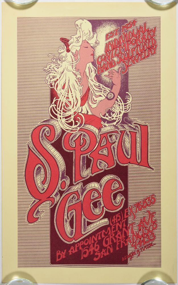 This is a vintage promotional poster designed by Randy Tuten for "S. Paul Gee," a modernist jewelry store located in San Francisco during the 1960s and 1970s. A beautiful Art Nouveau-inspired design!