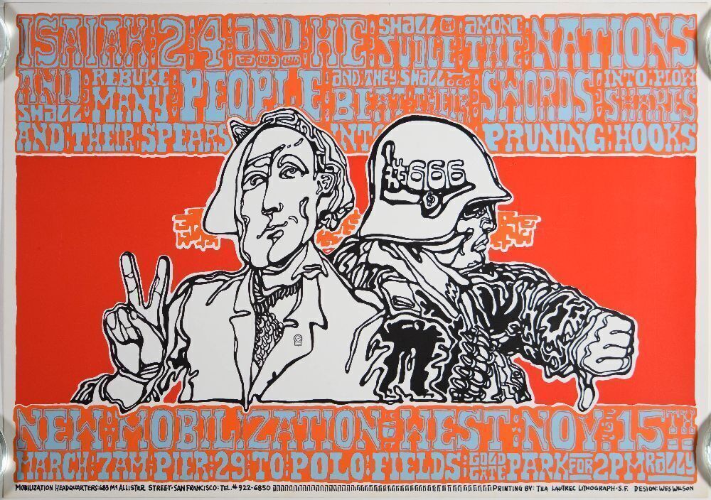 The late great Wes Wilson designed this anti-war march original poster in 1966. The march took place on November 15th starting at Golden Gate Ark and ending at the Polo Grounds in San Francisco. The text across the top is a quote from Isaiah 2:4 in the Bible, “And he shall judge among the nations and shall rebuke many people … and they shall beat their swords into plow shares and their spears into pruning hooks”. This San Francisco demonstration was perhaps overshadowed by the major anti-war protest that happened in Washington on the same day which attracted an estimated 250,000 war protesters.