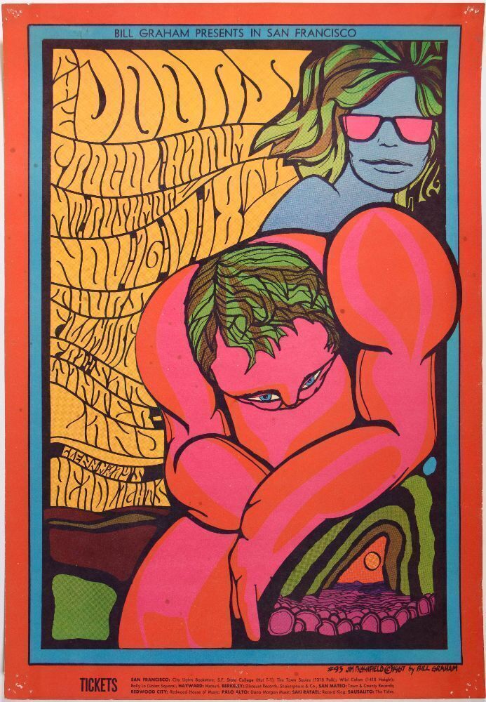 It's no secret that original first-printing posters featuring The Doors are one of the most sought collectibles in our marketplace today. Killer artwork by Jim Blashfield! Blashfield made several notable contributions to the Bill Graham numbered poster series. He also went on to become an internationally famous filmmaker who is responsible for producing several well-known music videos for Michael Jackson and Talking Heads, as well as short films.