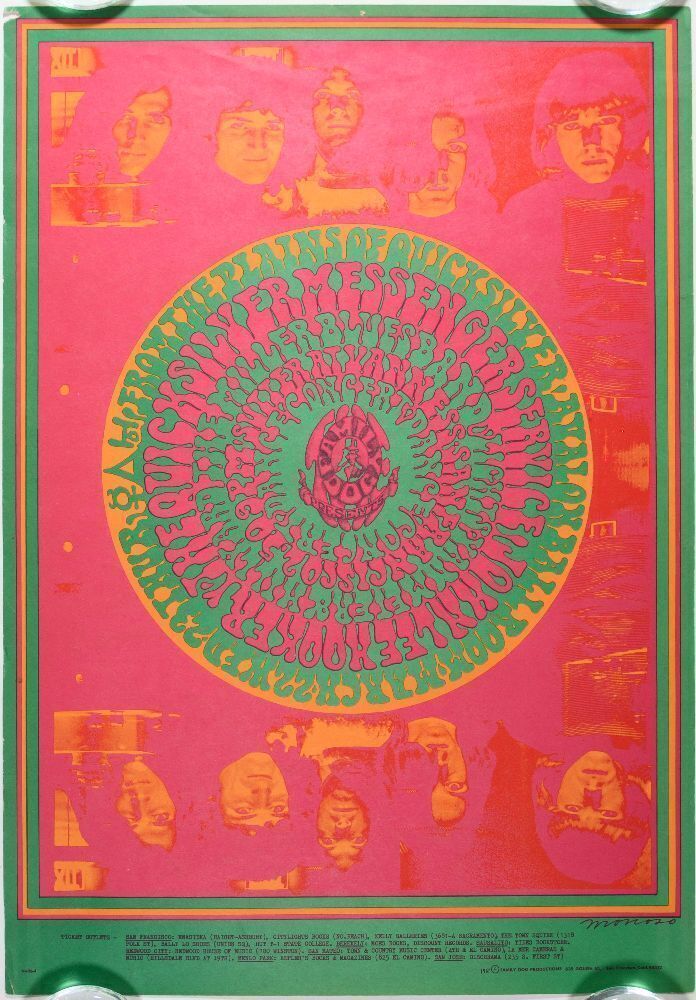 This hard-to-find Quicksilver Messenger Service, original first printing poster, is a Victor Moscoso masterpiece. The artist hit a new high point with this offering, a true gem in terms of design and lettering.