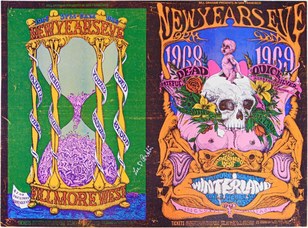 Here we have an original, uncut pair of Lee Conklin-designed, New Year's Eve 1968 posters, BG-152 & BG-153. One is for the Winterland New Years Eve party with the Grateful Dead & Santana, the other for the Fillmore West New Years Eve party with Vanilla Fudge, Richie Havens, Cold Blood, and more. These original posters, uncut, are very rare and difficult to find!