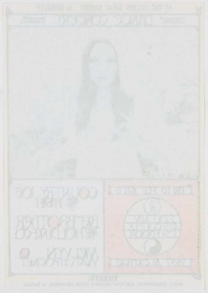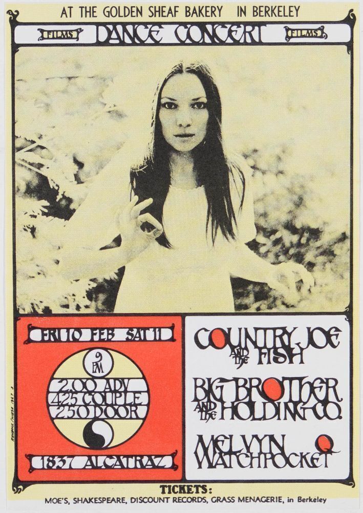 This Big Brother and Country Joe Original Handbill was produced for an early 1967 show in Berkeley at The Golden Sheaf Bakery. The artist Loren Rehbock also designed several other popular concert handbills for Berkeley area shows at the Finnish Brotherhood Hall for Country Joe and more.