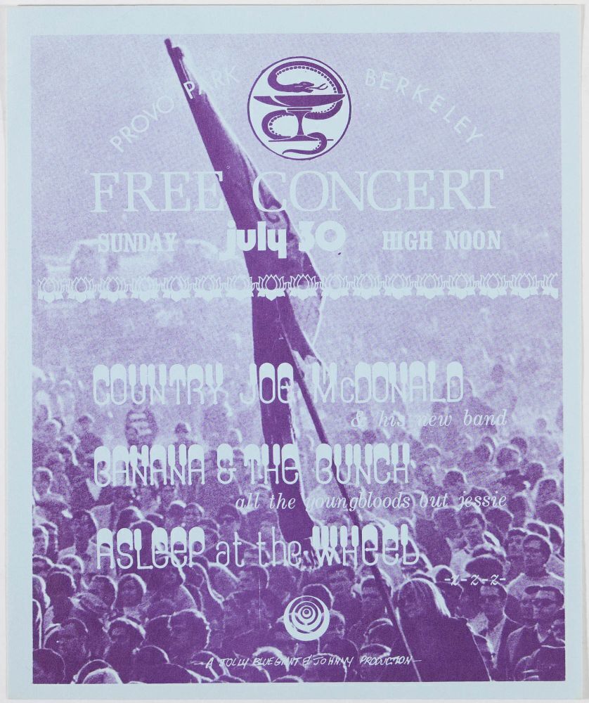 This vintage original handbill promoted Country Joe McDonald, Banana & The Bunch, Asleep At The Wheel and more playing at Provo Park in Berkeley, California, on July 30th 1972. The event was a free concert in the park.