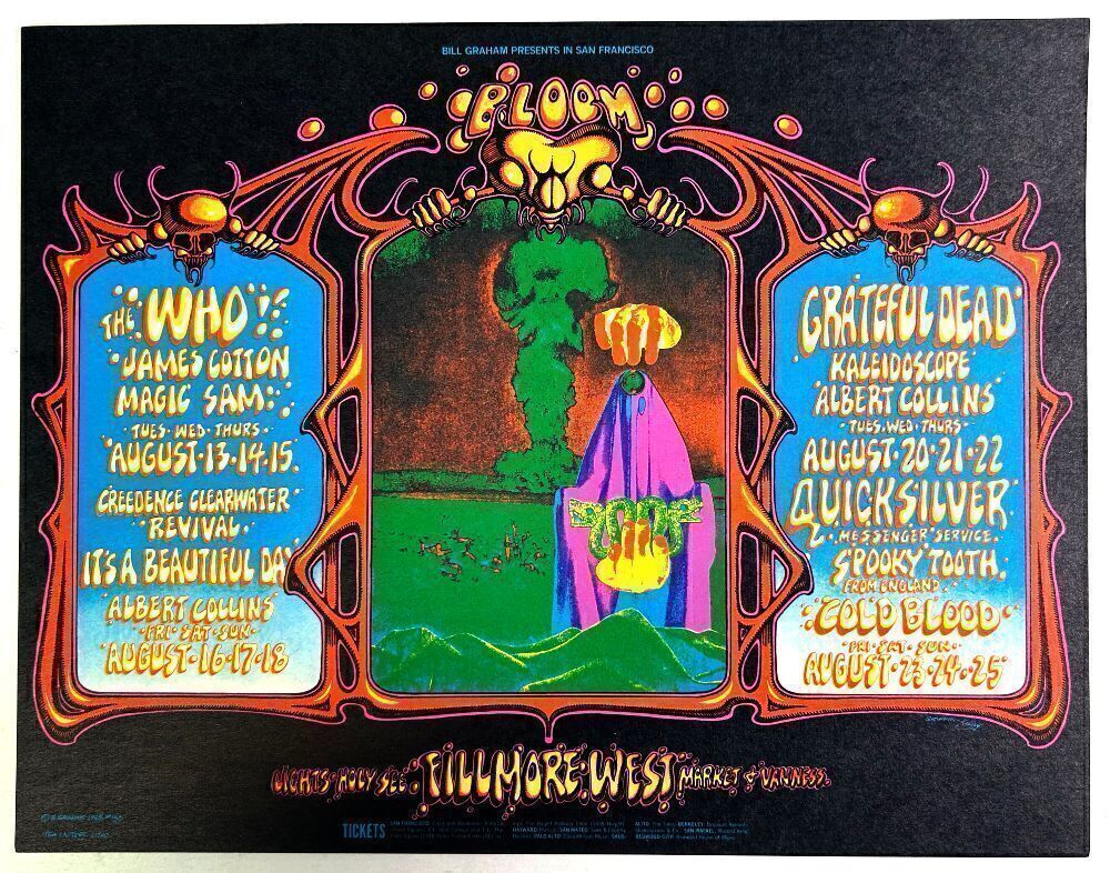 This original double-sized Postcard showcases a famous collaboration between Rick Griffin and Alton Kelley. The image was created to promote several weeks of shows in the summer of 1968. The month's lineup included powerhouse performances by the Who and the Grateful Dead at the Fillmore West. Griffin and Kelley, The Dead and The Who, talk about dynamic duos! The hit Magic Bus by The Who was released on July 27, 1968, about 2 weeks before their appearance at the Fillmore West listed on this incredible concert postcard, and their LP Magic Bus The Who On Tour was released in the U.S. on September 1, 1968, about two weeks after the show.