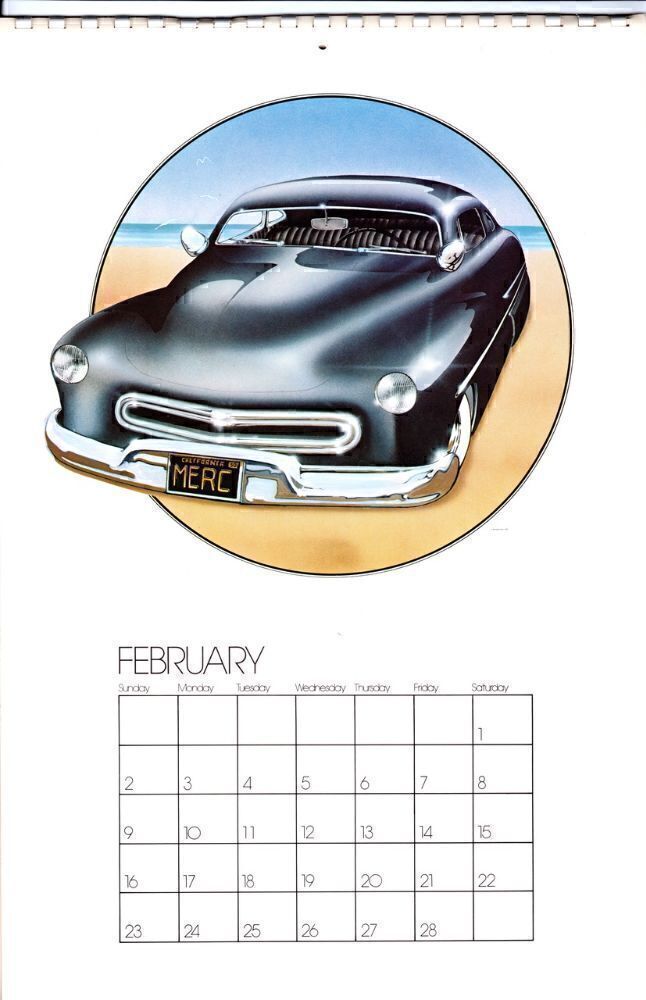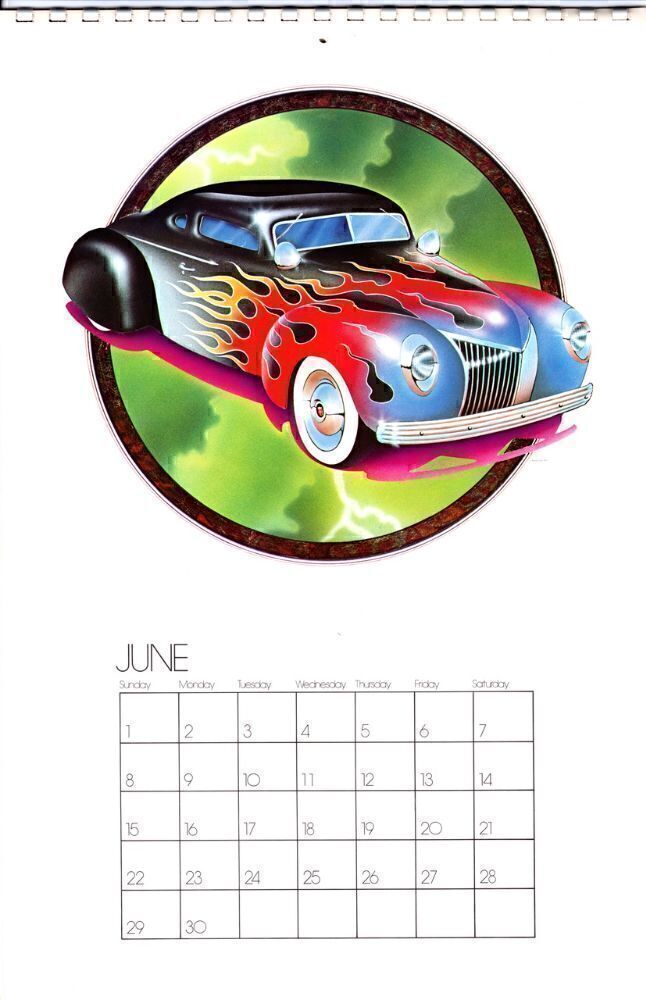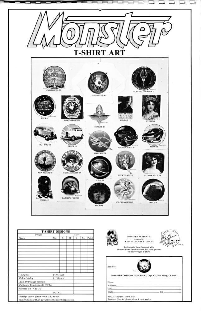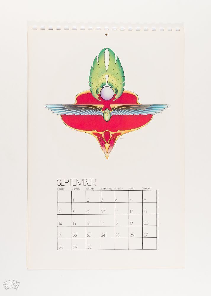Mouse Studios MONSTER Calendar 1975, First Printing. Features 13 full-color airbrush illustrations by Stanley Mouse & Alton Kelley produced for their Monster Company business. Included are several illustrations of The Flying Eyeball old hot rods, an old Merc a Deuce coupe, a Lady Luck illustration, a Flying Saucer in Outer Space, a couple of marijuana designs, and the beautiful Rolling Thunder psychedelic artwork. Printed on thick stock, plastic comb-bound at the top edge.