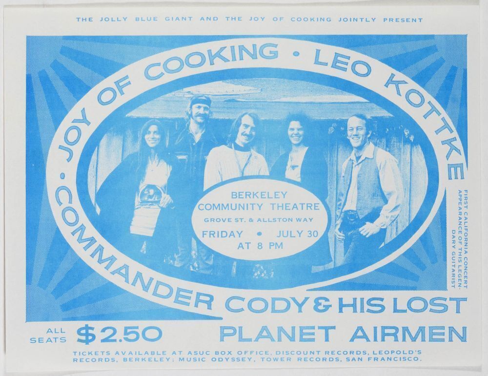 This original handbill announced Joy of Cooking, Leo Kottke, and Commander Cody & His Lost Planet Airmen at the Berkeley Community Theatre on July 30th, 1971.