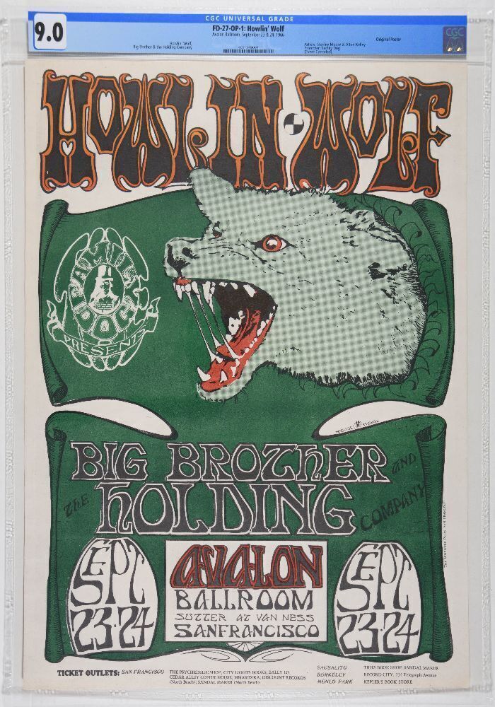 This is the OP-1 Original Pre-Concert First Printing version of this poster. The FD-27 issue was only printed before the concerts (there are no reprints), which makes this poster especially desirable and valuable. This powerful, original poster for a canceled Howlin' Wolf show at the Avalon features another classic Mouse/Kelley design. The shows themselves were canceled, but this classic image has remained a popular and important collectible in the series. This lot exhibits a great opportunity to add this showstopper issue to your Family Dog collection!