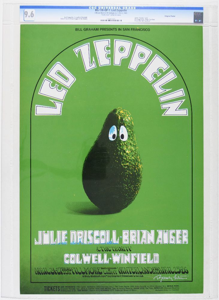 Led Zeppelin performed for Bill Graham's San Francisco audiences for the second time ever in April of 1969. Zeppelin achieved great recognition in a very brief time. Their first show at the Fillmore was just four months earlier and they were billed second behind Country Joe and the Fish. This time around they played two shows at the Fillmore West and two shows at the larger-capacity Winterland. This is one of those Zeppelin posters that everybody wants!