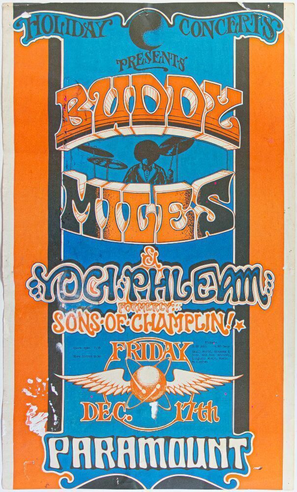 This beautiful poster was produced for Buddy Miles and Yogi Phlegm (formerly Sons of Champlin) appearing at The Paramount in Portland, Oregon on December 17th, 1971. Material from the Pacific Northwest is always considered special by collectors. They often tell a story all their own and have a different vibe than pieces from other parts of the country. Posters like this are highly collectible and are notably representative of the music-loving culture that produced them. We've never offered another example of this one in our auction!