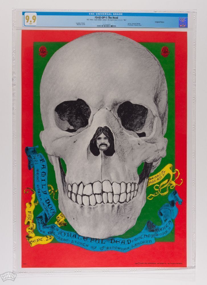 A HIGH-GRADE CGC 9.9 Original Poster! The Grateful Dead played a pair of shows at the short-lived Family Dog Venue in Denver Colorado in 1967. This advertisement for said event is a real sleeper among Dead posters. It features skull imagery with a pigpen nose. In addition, Grateful Dead is spelled out in the Skull's teeth.