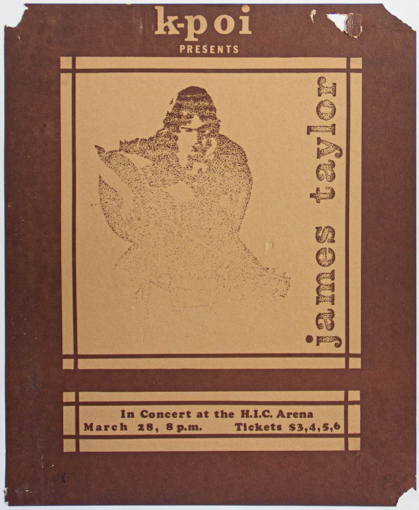 Presenting this poster for James Taylor appearing at H.I.C. Arena in Honolulu, Hawaii, on March 8th, 1971. James Taylor has become one of the most popular artists of all time, with not only an incredible singing voice, but also displaying extraordinary talent on the acoustic guitar - all from a very young age. He broke ground in 1970, and a year later achieved success with his recording of "You've Got a Friend," written by Carole King, the year this show occurred!