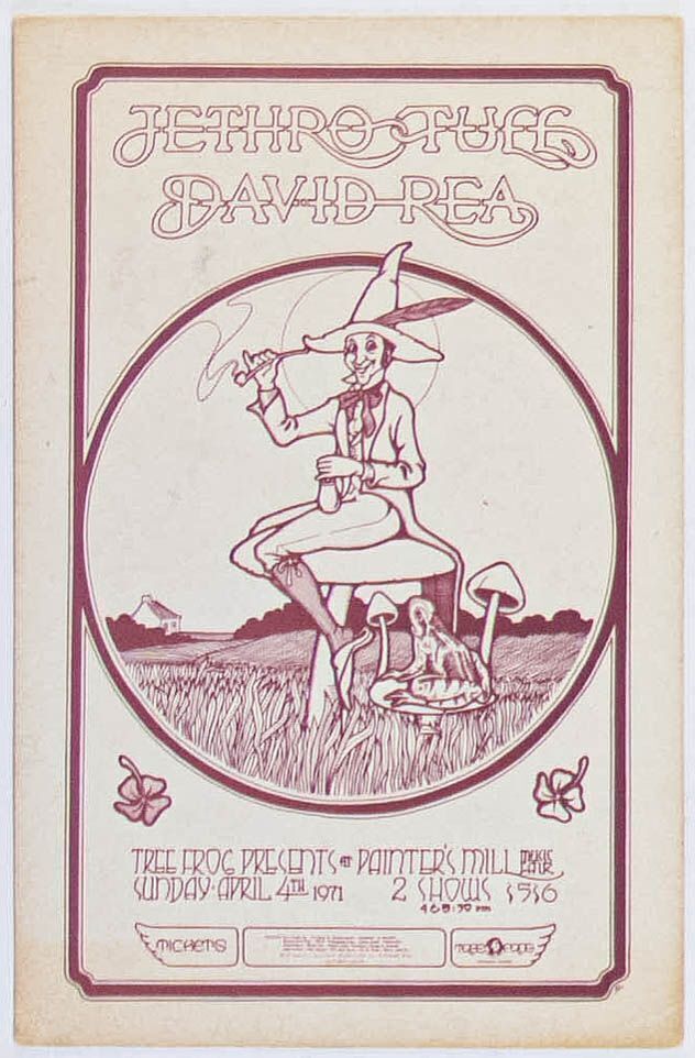 This original handbill was for a 1971 Jethro Tull concert (early & late show) held at Painter's Mill during early April, and according to reports, the 2nd show never happened because Ian Anderson's voice was shot after the first performance. The artwork was produced by Alan Rose, who went on to work with National Lampoon and create album artwork for bands including It's A Beautiful Day. Tree Frog Productions was a grassroots promotion company that staged concerts at Painters Mill Music Fair, a small theater in Owings Mills, Maryland, a suburb north of Baltimore. The handbills were printed in small quantities and are next to impossible to find in any condition.